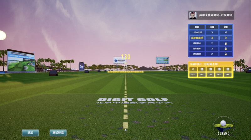 技能測試是經(jīng)過官方授權(quán)的DIGITGOLF軟件考試模塊。8個等級測試,全揮桿、推桿、切桿、沙坑、下場5個科目;用戶可根據(jù)需要自定義科目規(guī)則;場景多樣,增加趣味性。